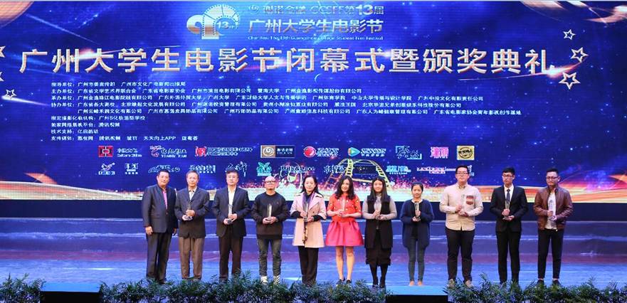 广东省电影家协会主席、珠江电影集团党委书记、董事长蔡伏青,暨南大学副校长饶敏,广东省电影家协会专职副主席宋枭楠,广东省委宣传部文艺处庄烁,广州市国有经营性文化资产监督管理办公室主任皮健,广州市文化广电新闻出版局副巡视员温朝辉,广州市文化广电新闻出版局财务处处长陈志斌,广州市演出电影有限公司董事长邓翅翔,广州金逸珠江电影院线总经理许斌彪,广州中投文化有限责任公司总经理岑力辉以及暨南大学、广州大学、广东财经大学、中山大学等高校有关单位领导和嘉宾与来自全国各高校的大学生代表济济一堂,参加闭幕式暨颁奖晚会,共同见证这一广东电影界与教育界发起的视听光影盛会。中文学院党委书记、第13届广州大学生电影节组委会副主席李和民率队参加了闭幕式。