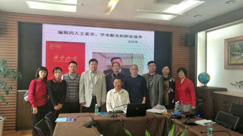 本网讯 12月13日上午,全国高等学校文科学报研究会原会长、《北京大学学报》(哲社版)原主编、北京大学博士生导师龙协涛教授为我校学术期刊编辑部同仁作了“编辑的人文素养、学术眼光和职业境界”专题报告。《国际经贸探索》主编肖鹞飞主持报告会,《现代外语》主编冉永平、大学学报主编刘小平以及《战略决策研究》、高教研究中心、校报编辑部同仁共20余人出席。