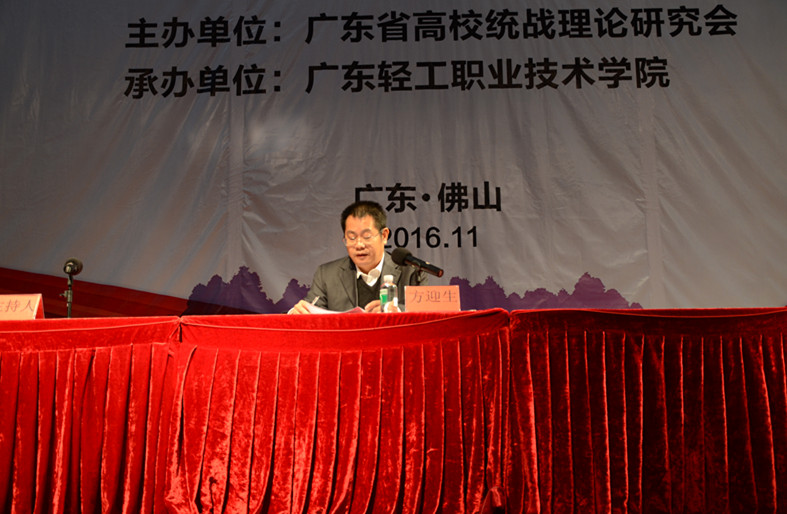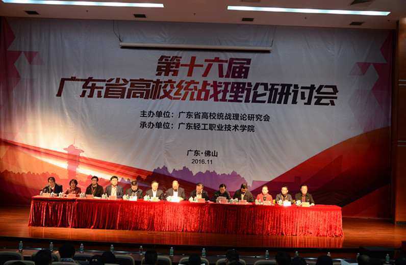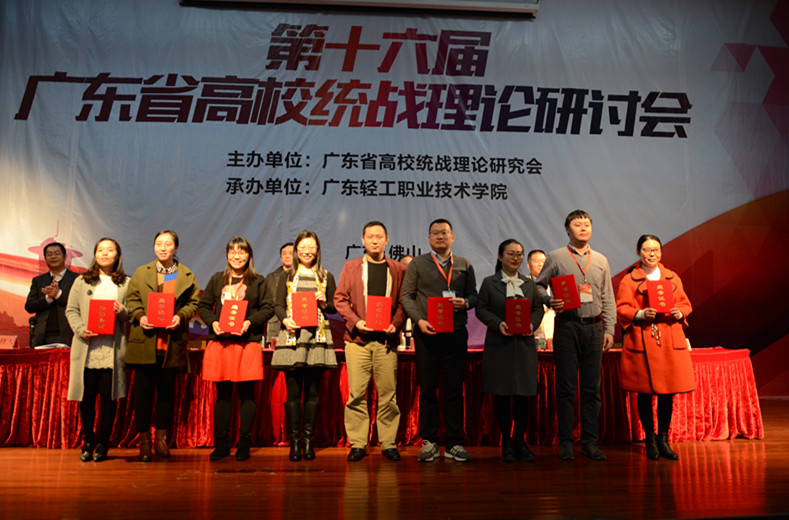 本网讯 11月24日下午,第十六届广东省高校统战理论研讨会在广东轻工职业技术学院南海校区召开。省委统战部巡视员何文洪、省委教育工委副书记景李虎、我校党委副书记石佑启、广东轻工职业技术学院党委书记杜安国等高校领导以及省内41所高校统战事业工作者、统战理论研究专家、学者等112人参加本次会议。大会表彰了2015-2016年度统战理论工作五类奖项,我校党委统战部获信息工作优秀奖,我校马克思主义学院党总支书记卢海清的论文《俄罗斯社会院与中国共产党统战工作的比较》获优秀论文奖。