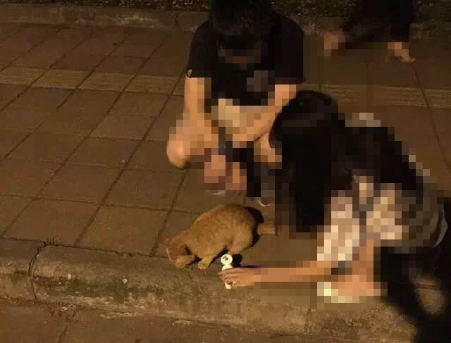 正在校道喂流浪猫的大四学生