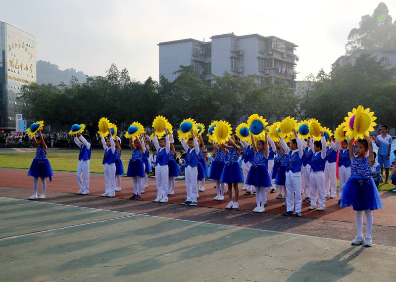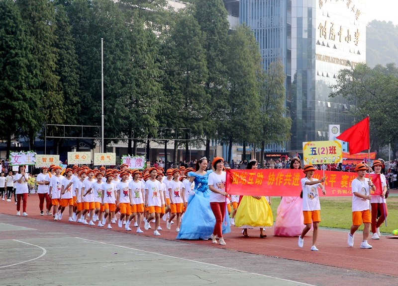 是日运动场上,锣鼓喧天。国旗方阵,校旗方阵,会徽、吉祥物方阵,红旗方阵,班级方阵,表演方阵,家长方阵和裁判员方阵等伴随着铿锵有力的运动员进行曲,步伐整齐、口号响亮,一一走过主席台前接受检阅。运动员们身穿各具特色的服装,家长变身白雪公主,还有舞狮、滑板、滑轮、击剑、乒乓球……独特的构思和巧妙的设计使各方阵成为运动场上靓丽的风景线。