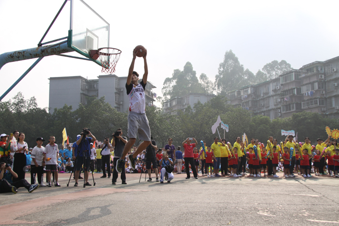 中国男子篮球职业联赛广州证券队原是佛山龙狮俱乐部,从这个赛季开始主场设在广州天河体育馆,这是广州历史上第一支CBA主场球队。谷玥灼是广州证券队今年通过选秀选中的大学生球员,球技、学习同样出色;身高2.06米的张晓磊曾是国家少年队和国家青年男篮的球员。开幕式结束后, 谷玥灼、张晓磊和大家进行互动,张晓磊现场表演了“暴力扣篮”,谷玥灼则一边耐心指导六七岁的孩子们如何运球,一边还跟年龄稍大一些的高年级孩子“聊人生”。