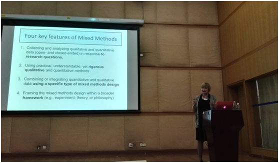 王初明教授对Moeller教授的讲座进行点评。他首先感谢Moeller对混合研究方法的介绍,他觉得这种方法这对老师们很有用处。王初明指出,尽管现在混合研究方法在中国开始得到关注,但是在研究中的应用并不多,希望Moeller教授能够在中国其他大学多做类似的讲授和普及。他认为Moeller教授在这方面做了一个很好的典范,希望老师们也能够多在实践中应用。