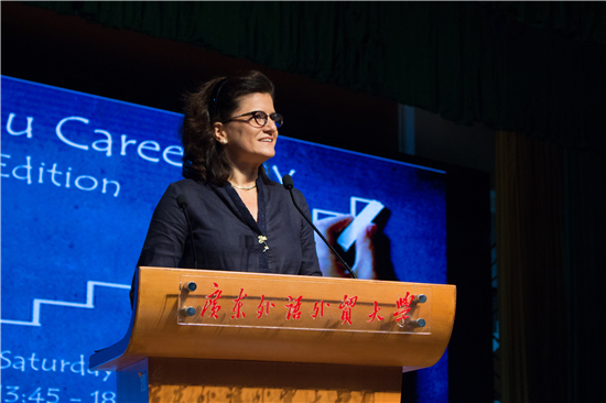 本网讯 10月22日下午,“意大利语言文化周”系列活动之“广州-意大利职业日”活动在我校举行,意大利驻广州总领馆总领事艾古丽女士为活动致辞,我校意大利语系全体师生参与了本次活动。“广州-意大利职业日”活动包括企业宣讲会和企业见面会两个部分。