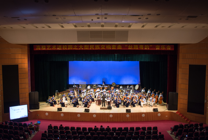 本网讯 古有百越先民远洋探索,今有南粤人民渡海交流。10月18日晚,高雅艺术进校园之大型民族交响套曲《丝路粤韵》音乐会在我校南校区大会堂举行。广东民族乐团用七个乐章,带领听众穿越历史长河,感受21世纪海上丝绸之路的历史溯源和时代魅力。音乐会由著名指挥家张列指挥。