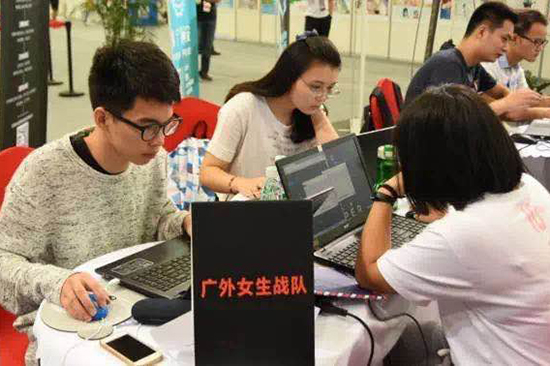 “广外女生战队”队员们正在进行紧张的赛题分析