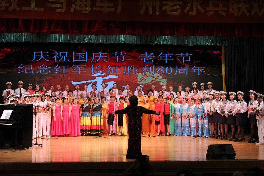 伴随着音乐声的响起,联欢会正式开始。老水兵艺术团慷慨激昂地朗诵与合唱《四渡赤水》、《长征》,仿佛把我们带回红军长征遭受重兵围追堵截的危急困局。而后气势恢宏的合唱又给我们展现了红军化险为夷、转危为安的场面,让观众深陷入其中。