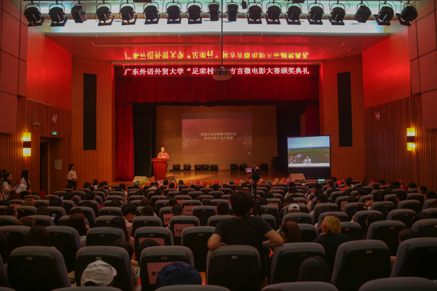 本网讯 9月28日晚,广外“足荣村”杯方言微电影大赛颁奖典礼在南校区艺术楼的小剧场举行,以微电影展映的方式向观众们展现了我国广袤大地的多样方言,更让观众思考方言在文化传承文化方面所起的重要作用,最终《南城小事》获得一等奖。出席本次颁奖典礼的嘉宾有“足荣村”方言电影节发起人、广东茂德公集团董事长陈宇先生,广州茂德公文化传播文化传播有限公司总监李安安女士,我校副校长刘海春,校团委书记苏奕、艺术学院院长李于昆等。