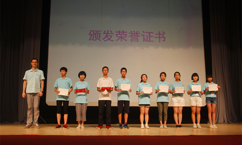 肖丽芳宣读关于表彰2016年快乐英语夏令营优秀学员、优秀班干部和优秀通讯员等的决定,外教老师们为获奖的学员颁奖并合影留念。