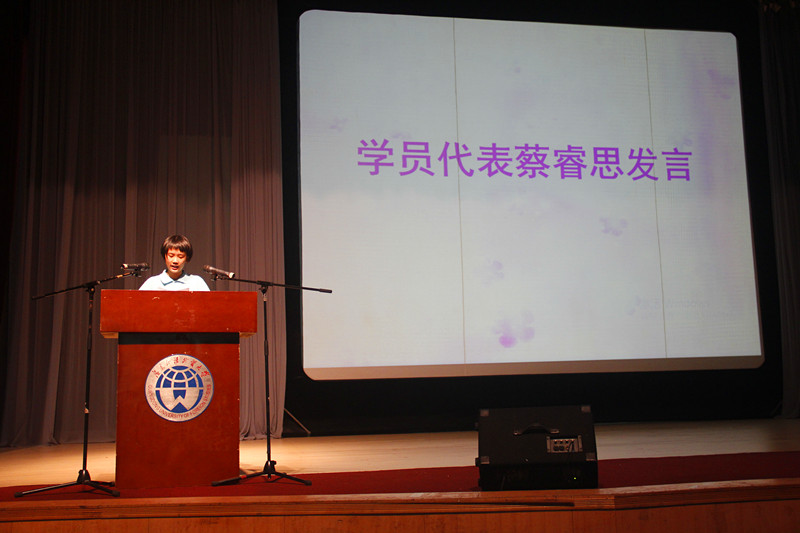 外教代表Casey表示她非常开心能有这样的机会与大家在一起学习英语,很多学员在老师们的帮助下开始大胆尝试说英语,这是很好的现象。夏令营时间不长,但她看到了大家的努力和进步,也很享受这个过程,同时她很期待下次还能和大家见面。紧接着,高中进阶班的蔡睿思作为学员代表随后上台发言。她跟大家分享了她在这个不同寻常的夏天参加了夏令营的充实经历,并感谢广外给大家提供了一个这么好学习环境和展现自我的舞台,让同学们快乐学习、快乐成长。