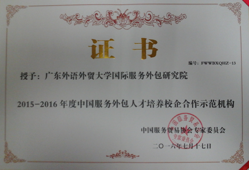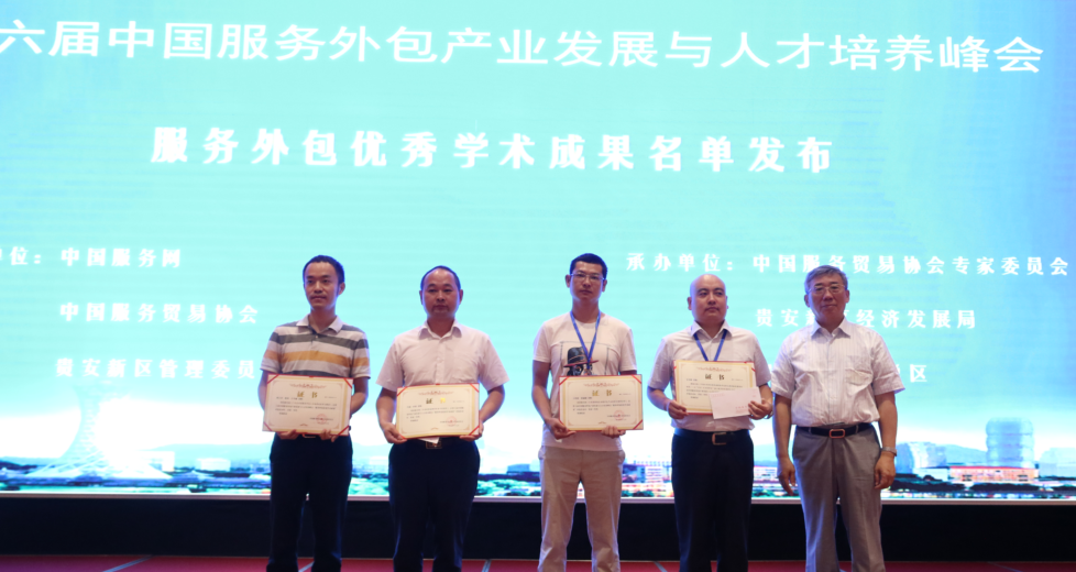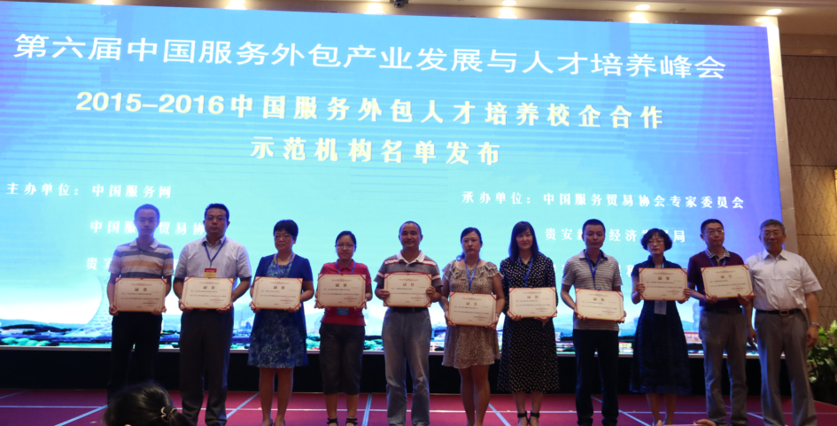 本网讯 7月16日-18日,第六届中国服务外包产业发展和人才培养峰会在贵州省贵阳市举办。大会发布了2015-2016年度中国服务外包人才培养校企合作示范机构名单和服务外包优秀学术成果名单。我校国际服务外包研究院喜获“2015-2016年度中国服务外包人才培养校企合作示范机构”荣誉称号。同时,国际服务外包研究院林吉双、陈和、丘冬娴提交的《广外应用型服外包人才培养的改革与探索》论文获得 “服务外包优秀学术成果二等奖”。