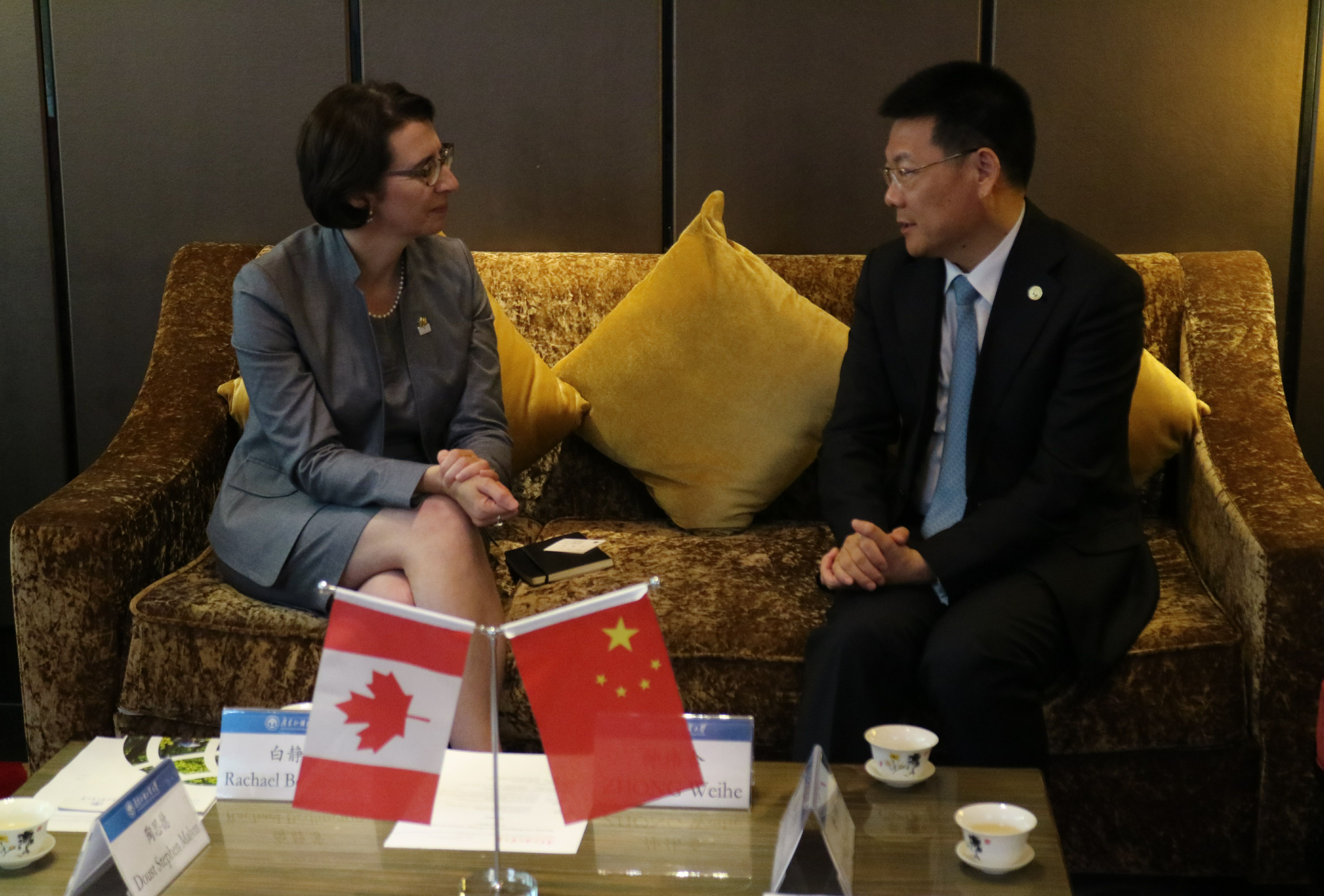 本网讯 7月20日,加拿大驻穗总领事白静芳(Rachael Bedlington)与加拿大驻穗领事陶思德(Doust Stephen Malvin)来访我校。我校校长仲伟合在广外国际学术交流中心会见来宾。加拿大研究中心主任唐小松及国际合作与交流处有关负责人陪同会见。