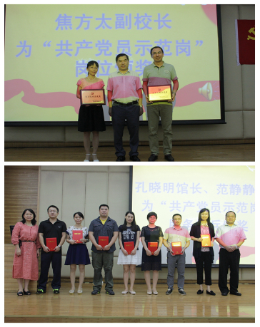 本网讯 7月1日,为热烈庆祝中国共产党建党95周年,我校图书馆相关人员在报告厅隆重集会,对“共产党员示范岗”进行表彰。校党委常委、副校长焦方太,党委组织部、图书馆相关领导及全馆党员和入党积极分子出席了本次大会。大会由图书馆党总支书记范静静主持。