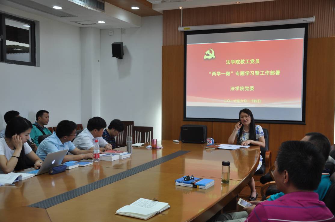 集中学习暨工作部署在法学院会议室举行。学院党委书记周秀娇带领全院教工党员,一起对学校“两学一做”相关文件进行学习,重点对中央、省委部署要求和学校“学党章党规、学系列讲话,做合格党员” 学习教育的重要意义、总体要求、主要内容进行了学习。