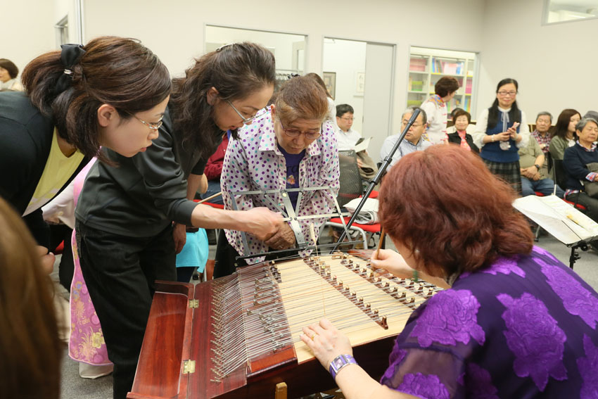 中场休息时,观众纷纷围着中国乐器,好奇地向演奏者们咨询,并在演奏者们的指导下,体验演奏中国民族乐器。樱井女士说:“我是第一次见到扬琴,它的构造与日本乐器大不相同,乐声太美妙独特了。”