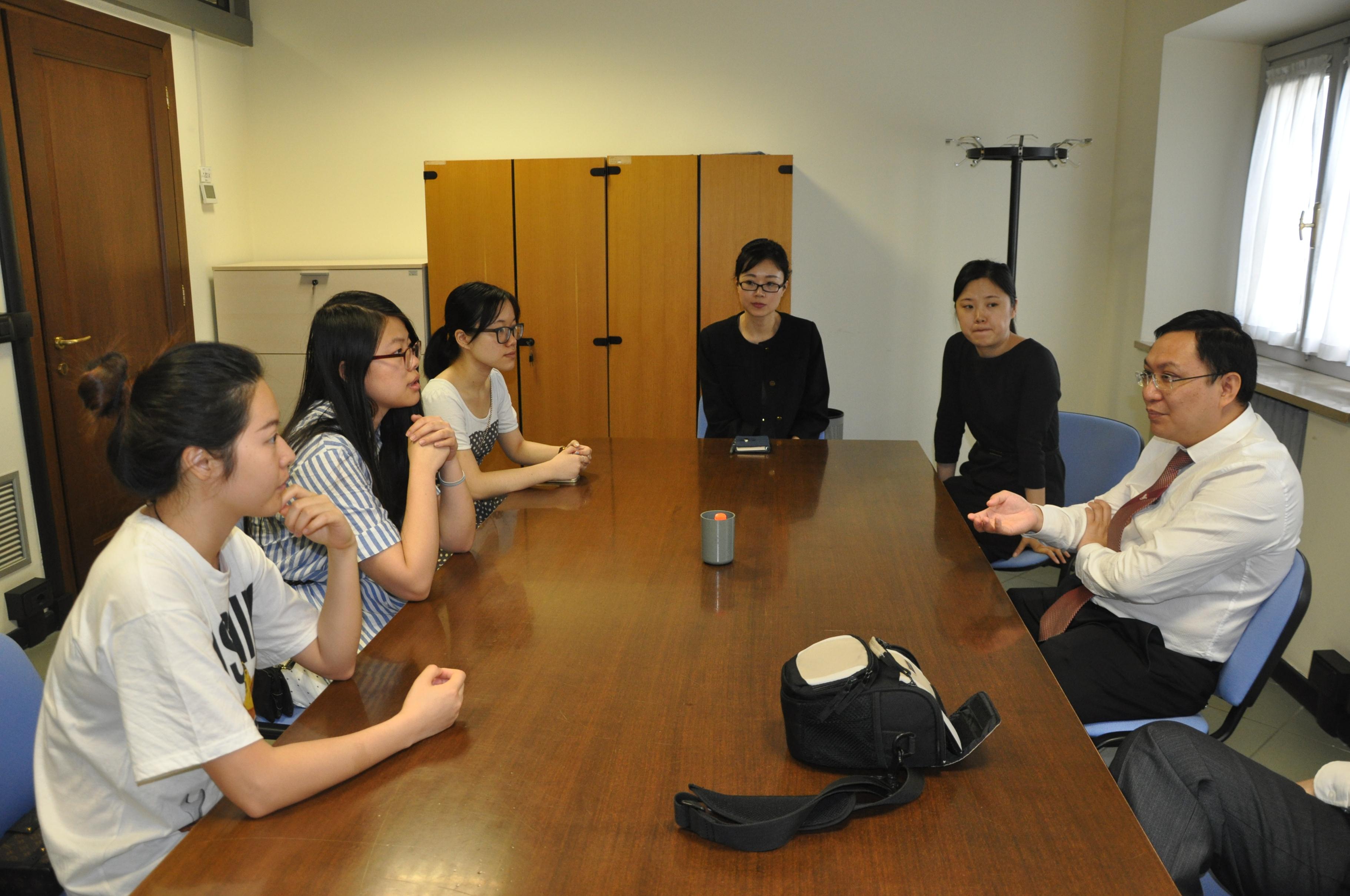 帕维亚大学是意大利的顶尖大学,也是全球最古老的大学之一。我校早在2009年就与该校签订了合作框架协议。目前,我校有7名意大利语学生在该校进行为期一年的交流学习。6月6日,刘海春在参观了帕维亚大学古老的图书馆、实验室等设施后,与我校的留学生代表进行座谈,了解其学习生活情况。在与Ilaria副校长以及帕维亚大学国际部的领导会谈中,刘海春首先对帕维亚大学坚持每年接收我校学生来留学进修表示感谢,并欢迎帕维亚大学派教师和学生到广外交流访学。在听取了意方对马可波罗/图兰朵计划的介绍之后,双方表示,将尽快签署协议,使得我校非意大利语专业的任何学生都可以通过马可波罗/图兰朵计划到帕维亚大学先学习一年意大利语,之后有机会进入意大利的任何大学进行专业学习和进修。