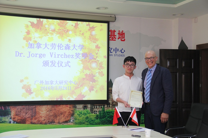 Dr. Jorge Virchez奖学金由Virchez博士个人出资设立,帮助世界各地的贫困本科学生到加拿大进行为期2-3周的生活和学习,以鼓励他们努力奋斗和增进各国青年对加拿大的了解。奖学金今年首次授予中国学生,奖学金选拔工作由Virchez博士委托广外加拿大研究中心实施。中心审核了申请人的学习成绩和研究计划,最终确定高翻学院本科生汪嘉琪入选。Virchez博士亲自为其颁发奖学金。