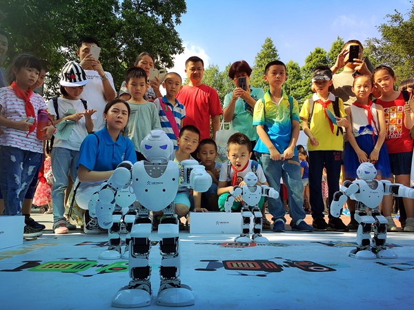 在科技展示区有无人机、VR体验、3D打印、未来教室、机器人体验、人机交互体验、PS4体感游戏等7个科技体验项目,孩子们爽朗的欢笑声和此起彼伏的赞叹声飘荡在明媚的阳光下,到处洋溢着欢乐的节日气氛。看“阿尔法”春晚跳舞机器人、3D打印机“吐出”一块块精美的巧克力、LEGO NXT2.0机器人与魔方机器人等科技小制作作品引人注目。体验区,五轴机械臂、遥控空中飞鱼、VR虚拟现实体验,令人眼花缭乱;手势控制夹娃娃机、与3D打印机器人猜拳,寻迹车与漂移自动射击车;弹奏“电子键盘”、做“冰激凌”、设计“3D模型”忙得不亦乐乎。最精彩的“无人机”伴随着微微凉风,直飞半空,爆发力十足,引起学生们阵阵惊呼声与掌声。