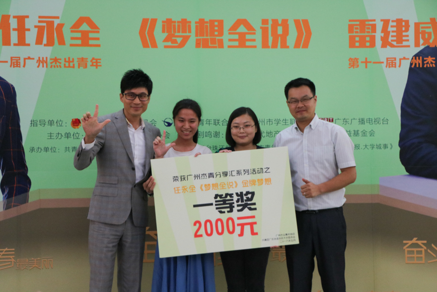 除了两位大梦想家的激情演讲,本次活动还安排了一个特别环节——“万元梦想基金”颁奖典礼。11位获奖的广外小“梦想家”受邀来到舞台,说出他们心中的梦想,青春梦想的气息充满了整个报告厅。“我的梦想是给爷爷奶奶拍一套属于他们的婚纱照。爷爷奶奶结婚时并不隆重,连结婚证也只是一纸盖章证明。现在老人家老了,身体大不如前,我不想让他们留下遗憾。”“金牌梦想”一等奖获得者,来自经贸学院1401的张嘉茹纯朴而充满孝意的梦想赢得了在场观众衷心的掌声。同样获奖的“广外梦彝乡公益团队”自2001年成立以来,一直致力于为四川凉山盐源县打柴坡小学建设图书馆。其代表汤锦沛说,团队会用1000元梦想基金为凉山的孩子购置图书和书架,为他们建设班级图书角。对于本次活动,他深有感触,“收获的不单是1000元,还有坚持梦想的勇气和力量”。来自商学院的骆同学表示,通过这次分享会,她学会了“面对梦想,‘明目张胆’”。