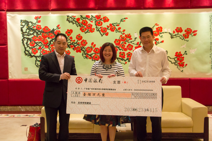 仲伟合代表学校对以肖菊芳为代表的校友表示真挚的感谢,“正是因为有着许多反哺学校的校友存在,才带动我们在校生以及更多校友积极回报母校,我们的广外才得以快速发展。”