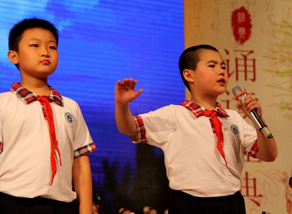 本次诵读经典活动,同学们的表演集诵、唱、舞、书、画等多种形式于一体,将文学与艺术进行揉合,多角度对古今经典进行演绎,弘扬民族文化。各班参赛同学用心灵来吟唱,真情演绎,节目效果绘声绘色、美不胜收。一年级3、4班的《三字经》,三年级2、3、4班的《诗词中的中国传统节日》,二年级5、6班的《说才学》,三年级1、5班的《中华好诗词》,四年级1、2班的《声律启蒙一东》展示了中华悠久文化的独特魅力;四年级3、4班的《春江花月夜》,一年级1、2班的《春天的秘密》向大家描绘了一幅幅春回大地、春和景明的秀丽篇章;二年级3、4班的《缅怀历史,励志兴邦》,五年级1班的《感悟杜甫》,二年级1、2班的《从军行》气势磅礴,让人充分感受到一代英雄忧国忧民的无尽情怀感情激奋;六年级1、2班的《中华少年》,六年级3、4的班《我骄傲,我是中国人》表达了孩子们身为中国人的自豪感与强烈的爱国热情;一年级5、6班的《古诗版小苹果》,让孩子们在活泼欢乐的氛围中体会古诗词文化,五年级3、4班的《最后一分钟》仿佛让大家翘首以盼曾经那个激动人心香港的时刻,五年2班的《我想》让大家幻想把他们的小手安在桃树上,把脚丫接在柳枝上,把眼睛装在风筝上。