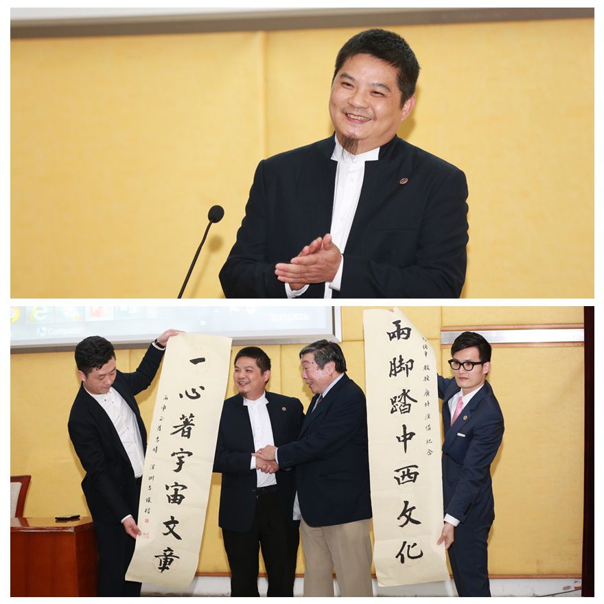 古朴担任讲座主持人。他向马佐平赠送对联以作纪念。