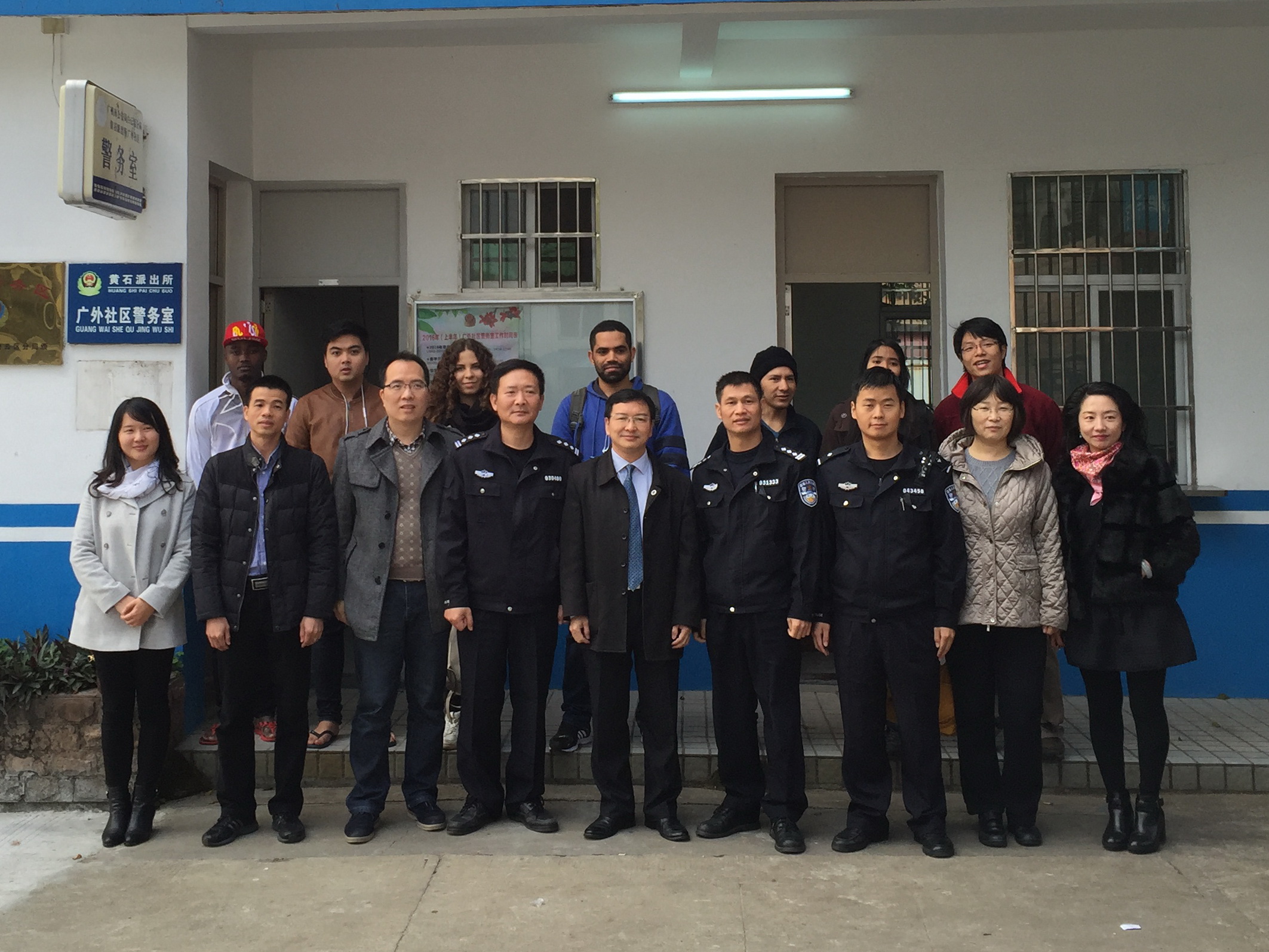 本网讯 为了帮助我校外国留学生更安全快捷地完成临时住宿登记工作,校保卫处、留学生教育学院及黄石街派出所三方通力合作,经过三个月的统筹协调,1月13日上午,黄石街派出所广外社区警务室(以下简称“警务室”)在第一饭堂旁正式启用。保卫处处长何越晖,留学生教育学院院长梁学宏、副院长王凤兰、吴艳,黄石派出所所长邹毅山、副所长曹卫平等出席了启用仪式。到场的还有来自俄罗斯、秘鲁、印度尼西亚、多哥和埃及的留学生。
