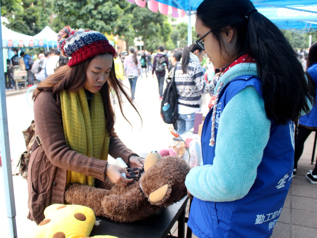 在活动中,有捐赠意向的学生可以直接将义卖品拿到摊位,也可以在摆摊现场或者云山勤工微信公众平台填写义捐信息收集表,再由工作人员上门收集。在工作人员的积极解说下,许多同学捐出自己的一些个人物品,如布娃娃、书籍、箱包等。 经过一个星期的义卖品收集、整理、分类和定价,12月8日,云山勤工公益类实体再次齐聚校道,将第一次收集到的义捐物品进行义卖。为表示支持,云山勤工的效益类实体当天也以从每位顾客的消费金额中捐出若干的方式参与了本次活动。