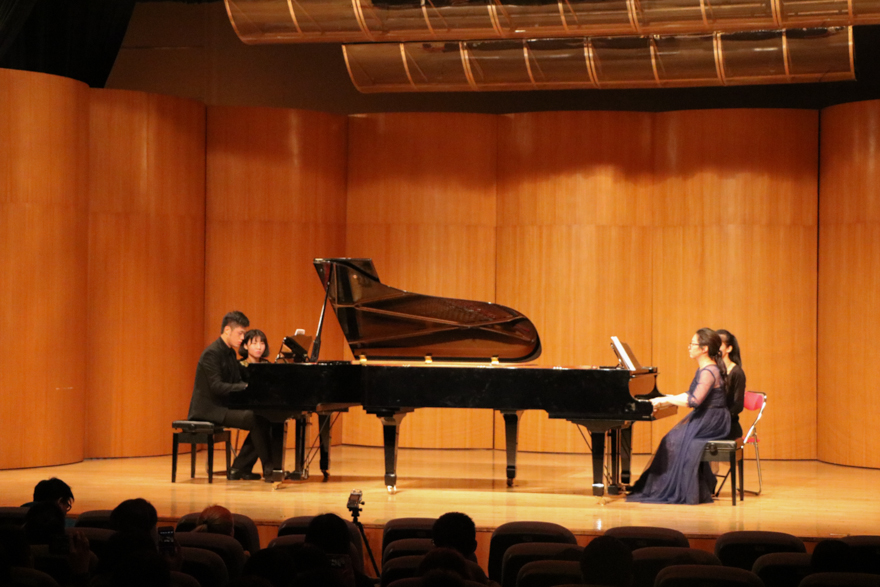 双钢琴演奏是当晚一大特色,许多观众都对此印象深刻。亮灯一刹那,两架大气的三角钢琴在舞台中央相对而设,气场庄严。首先是由郑远老师和魏陶影老师联袂带来的《自由探戈》。两位老师配合默契,完美诠释着高度默契的心动节奏,令整个演奏超脱听觉范畴,还从视觉上传递着乐曲的激昂。“这首曲子整体比较舒畅兴奋,感情层面上更让人容易接受。”现场一位观众说。随后,米媛老师和魏陶影老师带来的《D大调双钢琴奏鸣曲》。两位女老师相对而坐,曼妙的乐曲声从她们的手指间流淌出,让人感觉像是两位少女闺蜜在聊着自己的生活,又憧憬着未来。这种欢快的感情缓缓流淌整个小剧场,这场钢琴音乐会圆满结束。