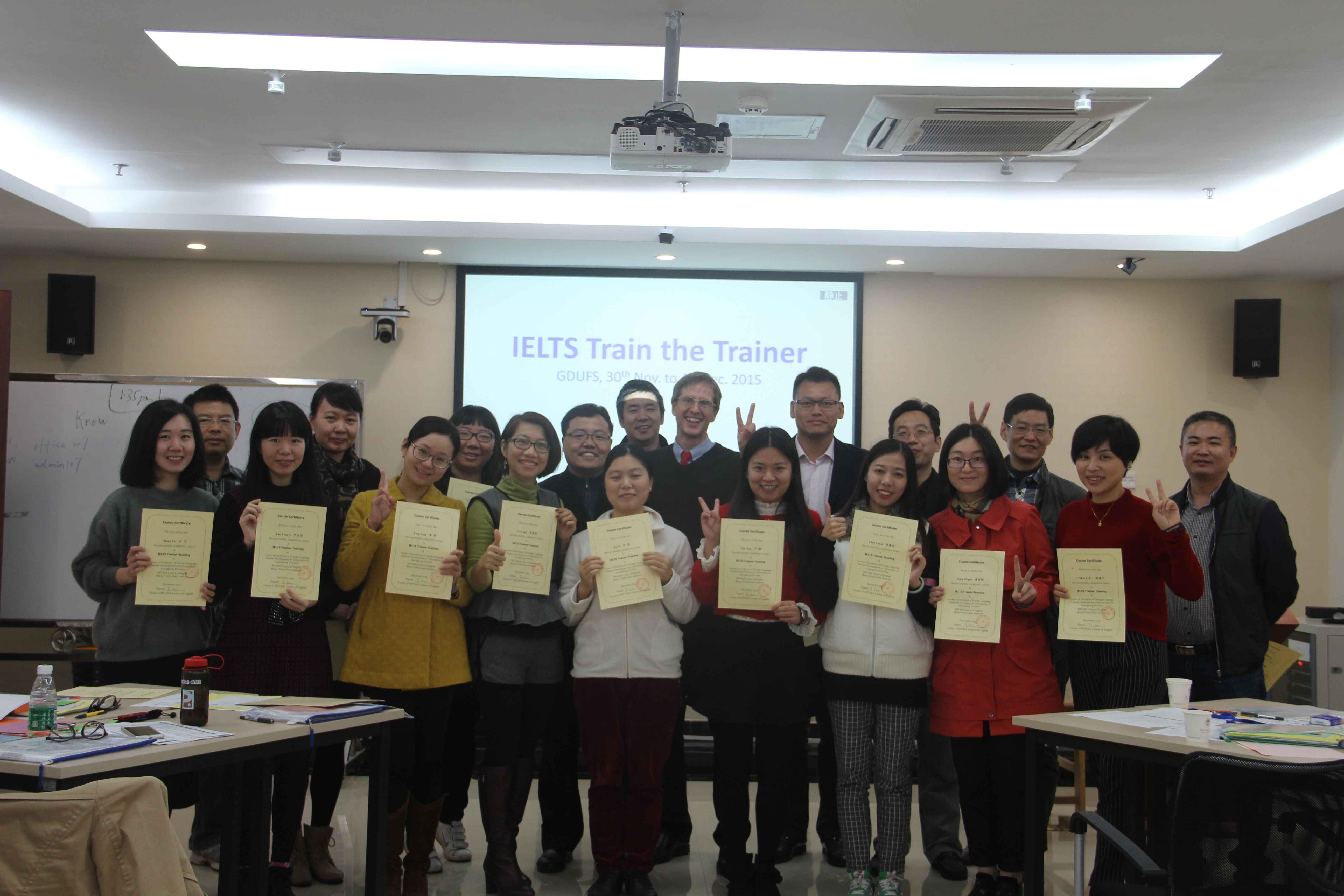 本网讯 近日,由广东省高校外语教师教学发展示范中心与澳门理工学院研发设计的第二期雅思导师培训精品课程(IELTS Trainer-Training Course)在教师发展中心落下帷幕。课程旨在帮助雅思教师更深入了解考试设计及相关教学备考方法,更加有针对性地为考生提供备考支持,吸引了广东、湖南等地10多名高校教师参与。来自我校商英、英教、继教(公开)学院及附设外校等10名教师也一同参加了本次培训。