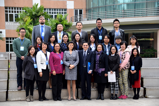 本网讯 12月11日上午,主题为“新媒体在意大利语教学中的应用”的学术研讨会在六教B103会议室举行。意大利驻广州总领馆总领事艾古丽女士、我校副校长方凡泉教授、中国意大利语教学研究会会长张宇靖、我校西语学院院长杨可及中国意大利语教学研究会各理事单位的教师代表参加会议。