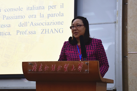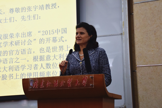 意大利驻广州总领事艾古丽女士致辞。通过数据分析,她总结了意大利语全世界传播取得的丰硕的成果。她提到意大利语在中国的传播也非常广泛,在习主席提出的“一带一路”构想的大背景下,意中将进一步加强及拓宽双方在各领域的合作与交流。最后,她还对全体意大利语教师在意大利语教学及文化传播方面做出的贡献表示了感谢。