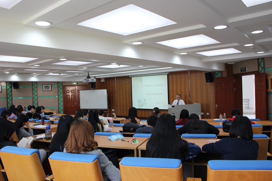 本次讲座由外语研究与语言服务协同创新中心、翻译学研究中心、西方语言文化学院、中国语言文化学院共同主办,是“云山跨学科翻译讲堂”第三讲。讲座由我校翻译学研究中心主任莫爱屏主持。讲座现场连续传译工作由我校西方语言文化学院法语系研究生李真承担。