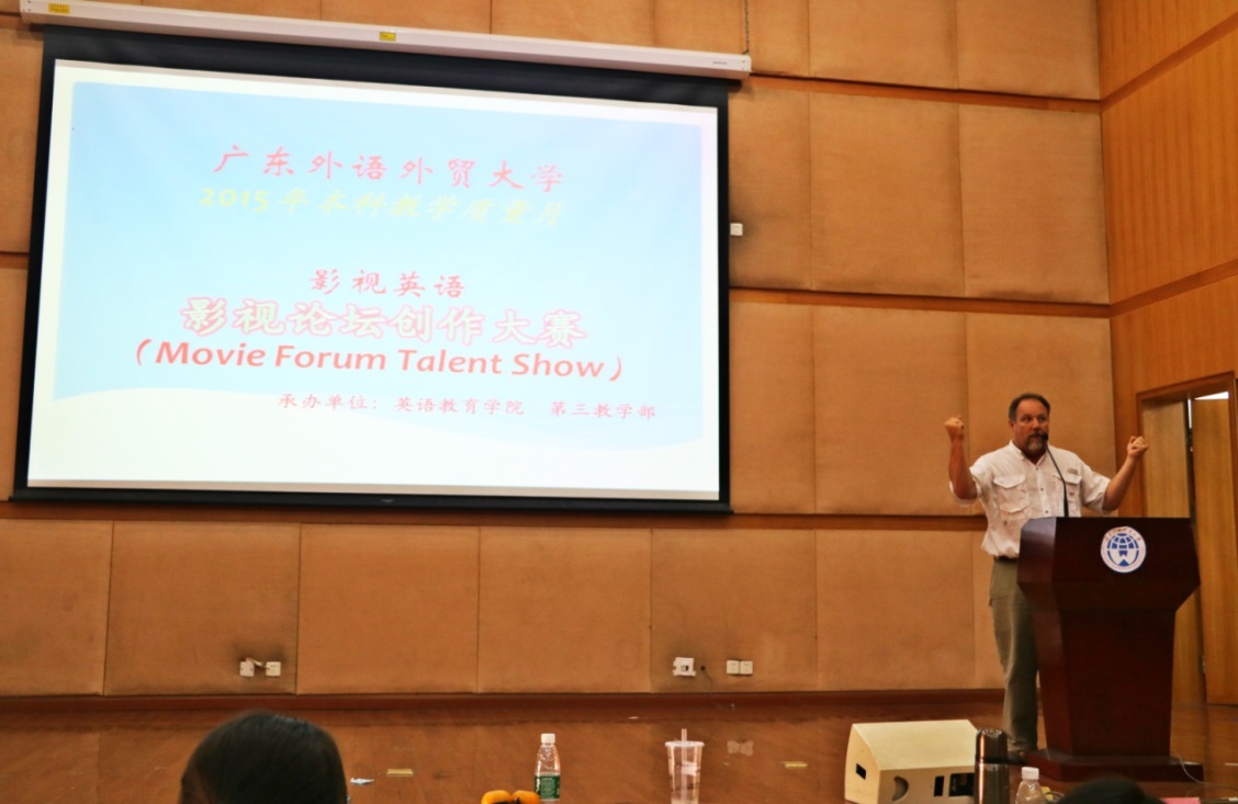 本次活动由英语教育学院主办,第三教学部承办。英语教育学院院长董金伟、副院长吴岩、第三教学部主任陶玉梅、《影视英语》教研室主任马小宇、外教Bob Lee,以及《影视英语》课程组老师出席了比赛,董金伟作开场致辞。