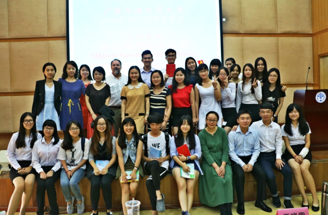 “影视英语”课程为我校特色必修、校级精品课程。自2007年起面向广东外语外贸大学非英语专业本科学生开设。该课程利用真实自然和生动地道的影视语言环境夯实学生的听说基础,培养学生对影视作品的理解能力,并提炼出有文化内涵的主题或者有争议性的话题,激发学生思考、分析、讨论、批判或辩论,培养学生“学贯中西”的能力。课程将“以学生为中心”的教学理念贯穿于教学之中,强调学生的口语锻炼、创造性和批判性思维能力的培养,受到学生欢迎。影视论坛作为影视英语课程极具特色和创新的实践教学活动之一,以自编教材精选电影所提炼的文化主题以及学习者感兴趣的文化主题为切入点,进行各种形式的创作,如:自由论坛、辩论、脱口秀节目、改写/创作剧本、评论、访谈、影视剧配音等,并制作成mp3或拍摄成DV。