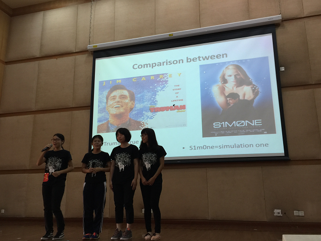 第一支队伍来自会计学院,她们通过对比《楚门的世界》(The Truman Show)及《西蒙妮》(Simone)两部电影,来剖析虚拟世界与真实世界的差别。娴熟的影片截取,巧妙的对比,加上情感丰富的配音,令全场观众赞叹选手们的综合实力。她们以独特的视角提出了 “Cheating the world or being cheated by the world, which is more lonely?” 这样引人深思的问题。