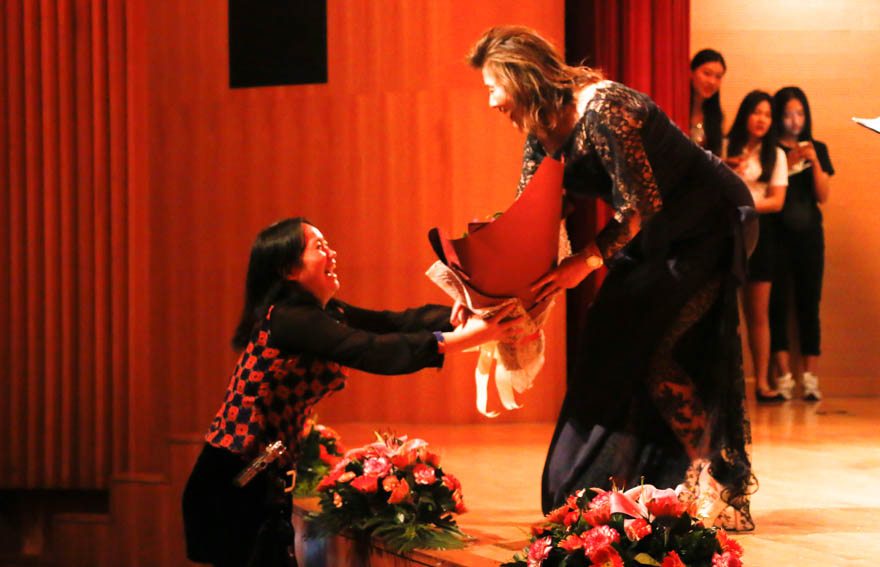 本网讯 11月19日下午,南校区艺术楼小剧场座无虚席。现居瑞士的著名女中音歌唱家李怡萍在瑞士苏黎世国家歌剧院顶级钢琴艺术指导托马斯先生的伴奏下,在这里举行独唱音乐会“丝绸之路的歌声”,让观众的耳朵与心灵都享受到了一场饕餮盛宴。
