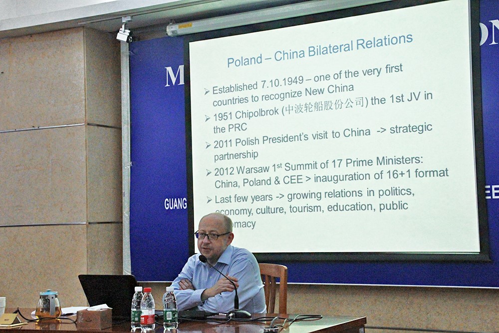 又讯 11月9日,前波兰驻华大使塔德乌什·霍米茨基(Tadeusz Chomicki)先生在受聘为我校客座教授后,以主讲嘉宾的身份出席了由西语学院波兰语系举办的题为“波中建交66周年后的双边关系”的学术讲座。讲座由波兰语系系主任茅银辉主持。出席讲座的还有波兰驻广州领事馆总领事约安娜·斯科柴克(Joanna Skoczek)和波兰雅盖隆大学对外波兰语教学中心主任彼得•豪尔巴托夫斯基(Piotr Horbatowski)。