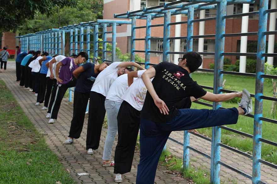 当靠在栏杆上拉筋时,队长和拳组长们会鞭策大家,“上一杠,再上一杠”,有的会员在千锤百炼之后真的做到了,柔韧度变好,这是挑战自己成功后富有成就感的乐趣;“长拳女神”组长有“疯狂30秒”的训练项目,仰卧起坐、俯卧撑、跳拍掌三组动作连续做,完成后训练者能感受到肌肉受练到一定程度后撕裂重组的快感;大二的会员们夏训过后参加省赛,代表学校光荣得奖,这是“付出的时间跟收获成正比”的充实感。趣味最足的画面要数南枝组用声控自拍下一字马了——八个南枝组成员排成一排,把手机调成声控自拍模式,对准八个人,随后,组长轻喊一声:“一字马,下!”大家便熟络地让大小腿直直地与地面贴合,待大家的一字马都下去了,他们对着手机大喊:“拍照!”然后用手比划各种稀奇古怪的姿势。声色并茂的训练场景,回忆起来都是多彩的。