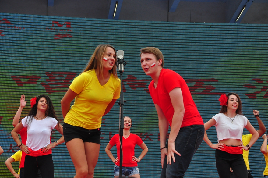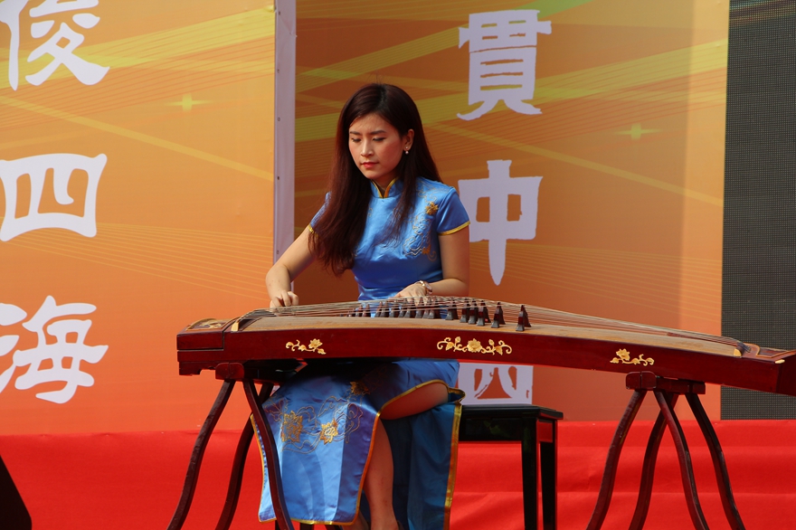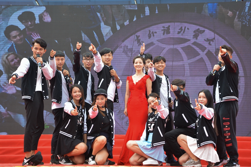 在我校领导和学子用多个语种送上“我在广外等你”的号召后,艺术学院的学生身着我校纪念服演唱建校五十周年原创歌曲《我在广外等你》,穿着极富现代感的学子踏着节拍,用古典乐器奏出一曲时尚版的《新民乐串烧——茉莉花开》。演出主持人是我校学生及校友,在回顾了自己心中独有的广外记忆后,他们号召现场观看的校友一齐向母校喊出“广外,我向你报到!”。会场还播放了来自全球各地广外校友的视频祝福,所有人的声音回荡在操场上空,形成对我校五十华诞最美的祝福。