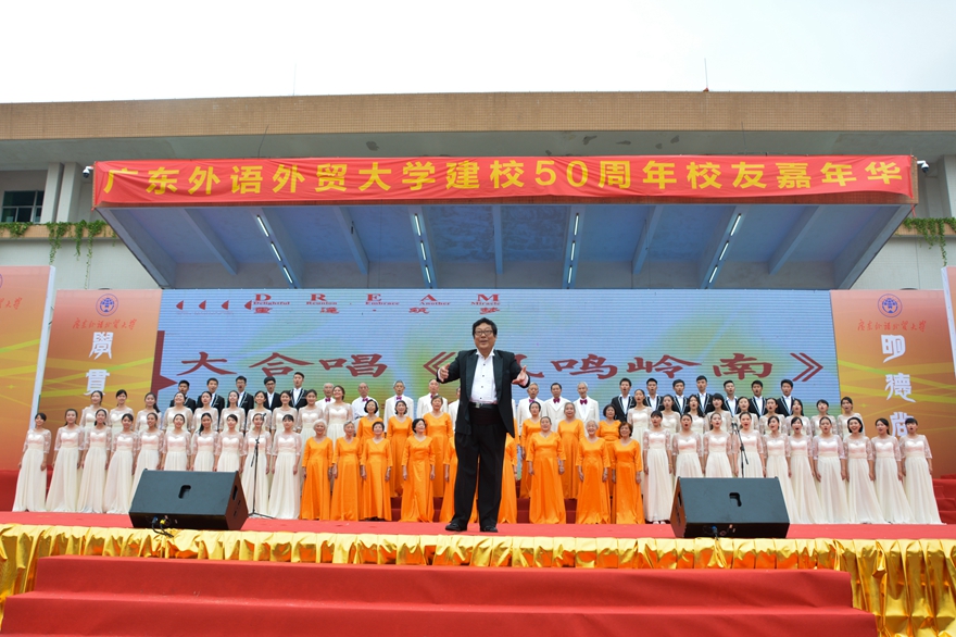 最后,主持人号召全体观众起立共唱校歌,熟悉的旋律勾起了校友对于广外生活的回忆。