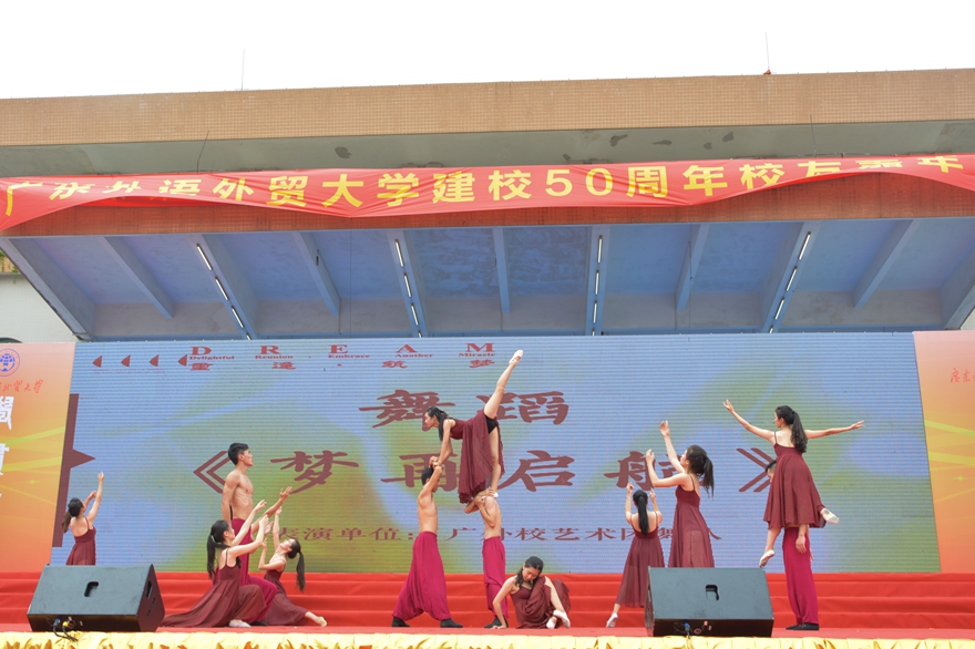 富有张力的舞蹈《梦再启航》和国魅拉拉队火热的舞台表演再一次点燃了现场的气氛,向全场广外校友和广外学子展现了广外人激扬的青春活力。而中文学院创意写作团献上的《五十华颂》则表达了对母校深深的自豪和眷恋。由留学生学院、艺术学院、校歌队联袂编排的一场跨越国界的《唱响五洲》展现了我校“学贯中西”的特色。