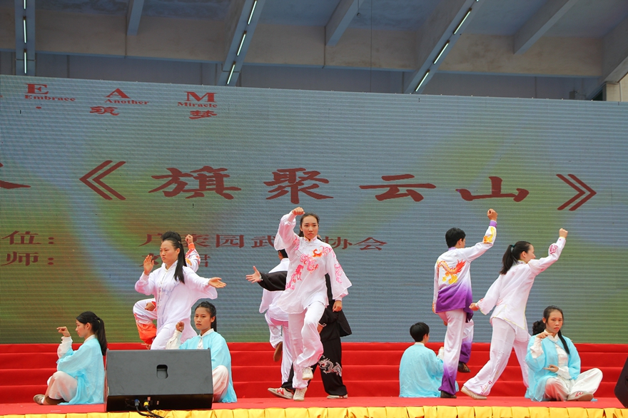 首先上场的是广袤园武术协会的《旗聚云山》武术表演,83位手持广外校旗或“重逢·筑梦”旗的学子排成阵列,气势磅礴地挥舞大旗,虎虎生风。身着各色短打的武协成员奔上舞台,向观众分别展示了武当、南拳、咏春、长拳等中国传统武术派系,练大刀与长棍的同学之间精彩的过招引得现场尖叫连连。