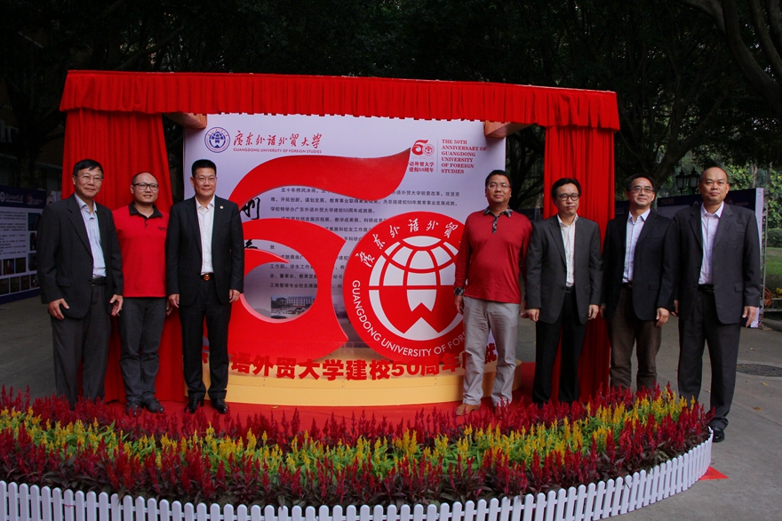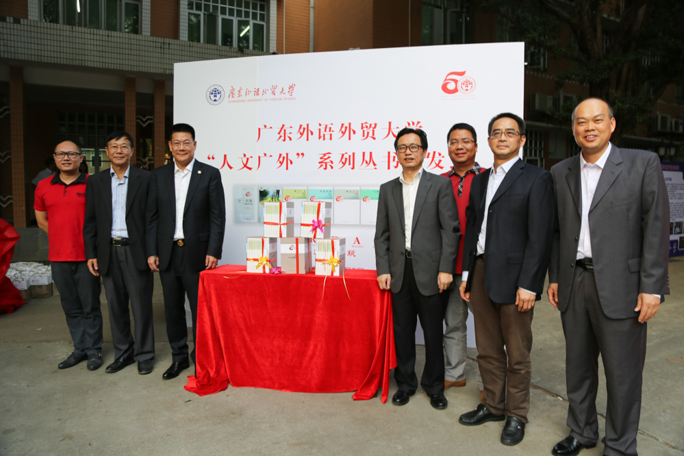 本网讯 11月5日下午,建校50周年成就展揭幕暨“人文广外”系列丛书首发式在北校主校道举行。前来出席仪式的有南方出版传媒股份有限公司副总经理何祖敏、出版部总监萧宿荣,广东人民出版社副总编辑倪腊松,98级工商管理校友蒋国页、柯艳青、赵松光;我校校长仲伟合、校党委副书记卢景辉、原校党委副书记陈建平以及“人文广外”系列丛书编委会委员、建校50周年成就展参展单位负责人等也参加了该活动。