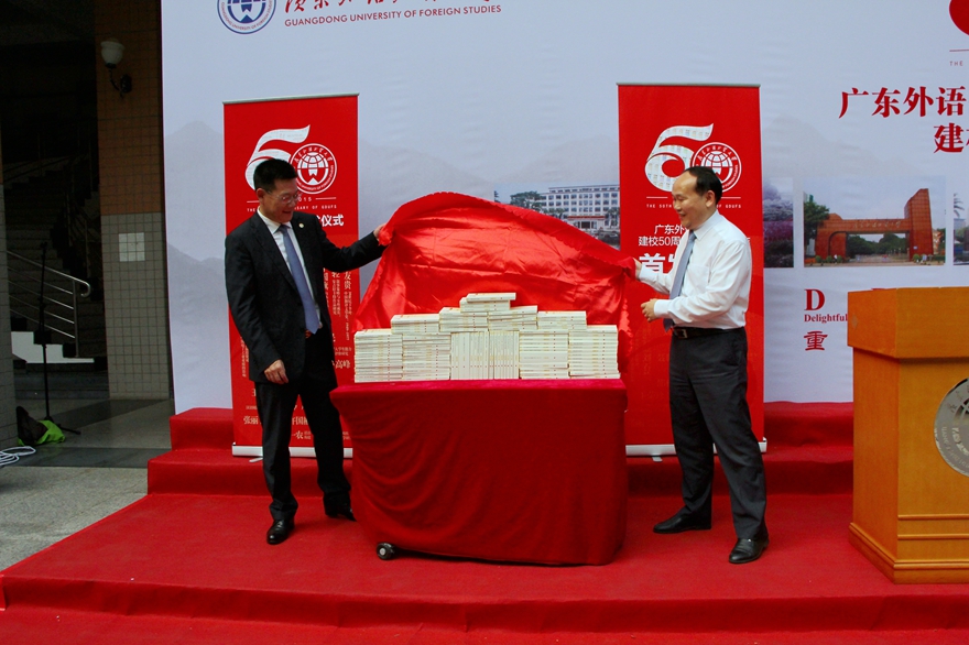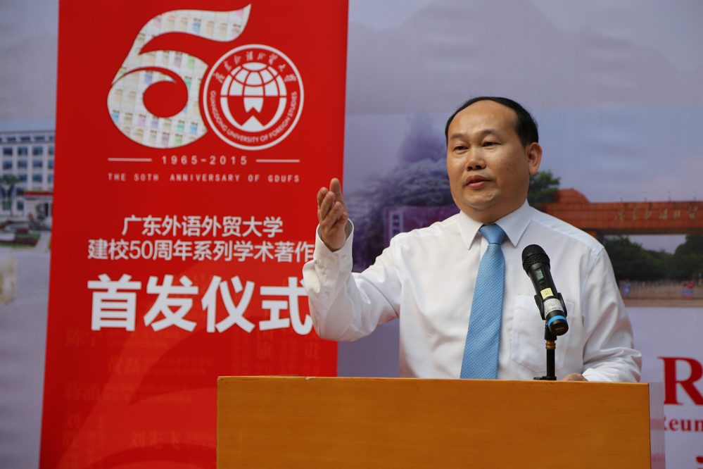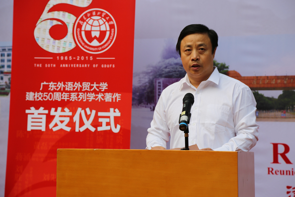 揭幕仪式后,仲伟合发表致辞。他表示,学术精品著作的出版凝结了新老广外人拳拳的爱校之情,书写着广外50年艰苦奋斗、薪火相传、硕果累累的壮美华章,是一份厚礼。50年来学校科研项目上档次、科研成果上水平、科研实力上台阶,得益于诸位老师的奉献。他希望,各位老师尤其是青年老师要志存高远、追求卓越,要凝神静气、多出精品。