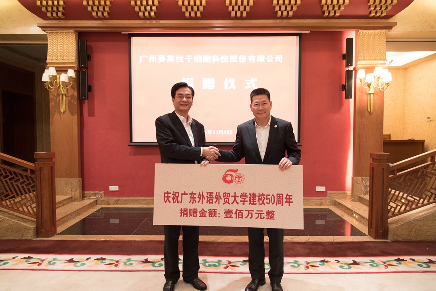 本网讯 11月3日下午,广东省青联副主席、赛莱拉干细胞科技股份公司向我校创新创业基金捐款100万元。该公司董事长陈海佳一行,我校校长仲伟合、副校长刘海春以及学校相关部门负责人出席了捐赠仪式。