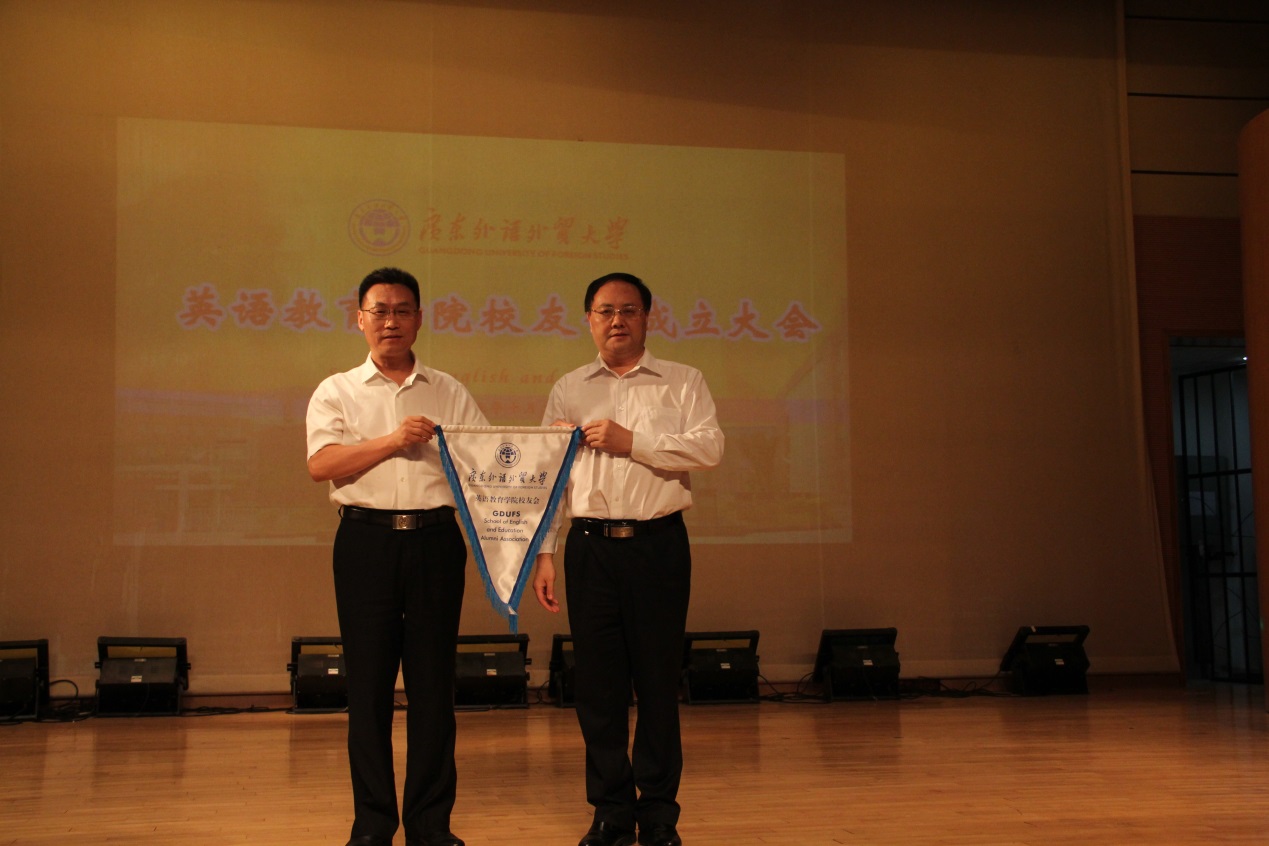石佑启代表学校讲话。他首先对英教校友会的成立表示祝贺,并对到场校友表示热烈欢迎。他对英教在教师国际化、学生国际化等“四化”中做出的贡献做出了高度评价,表示这是学校实施教育现代化战略的重要部分,并对学院以及校友会的发展表示了衷心祝愿。他提到,“当前母校正处于发展的关键期,英教学院也迎来了发展的大好机遇。前景无限美好,事业催人奋进。衷心希望各校友一如既往的关心、关爱、关注和支持英语教育学院和母校的发展。”石佑启还代表学校向董金伟授予校友会会旗。