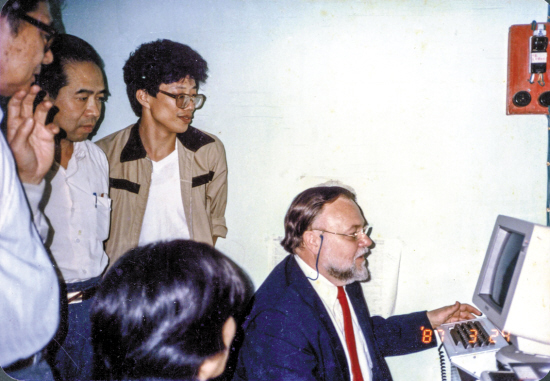 1987年,美国教育测试服务中心高级研究员曼宁先生与教委、省招办负责人、广外教授研讨英语标准化考试问题。图为曼宁先生上机演示操作