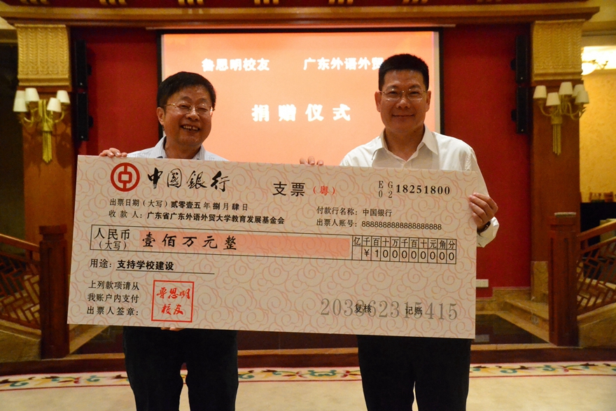 本网讯 8月4日下午,日语79级校友、北京校友会会长鲁思明向母校捐资100万元,用于北校区第一教学楼重建计划。校长仲伟合代表学校接受捐赠。仪式由副校长何传添主持,党办校办主任植秀聪、三会秘书长谢伟光和来自北京、香港、佛山、深圳、海南、广州等地的校友代表参加了捐赠仪式。