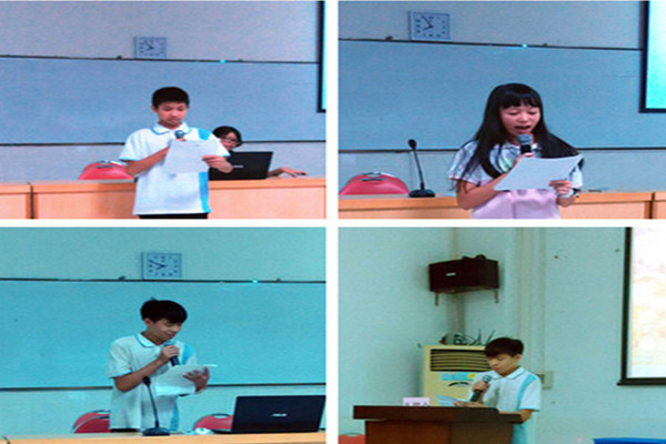 在主持人的组织下,各班随机抽取的学生依次走到台上,流利地读出了已经练习多次的独白。尽管有些单词对于初中生来说还是有些难度,但他们都尽自己所能把稿子念完。